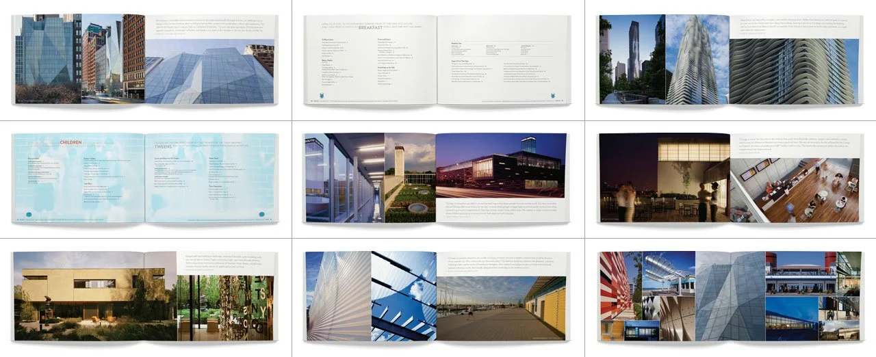 In creating a unique in-room menu for the Four Seasons Hotel Chicago, we collaborated with local architects from Chicago. This distinctive menu design showcases their work in a modular format, offering an easily customizable in-room dining experience. The included photos are not the typical images found in architectural guidebooks, providing a fresh perspective on the showcased projects.